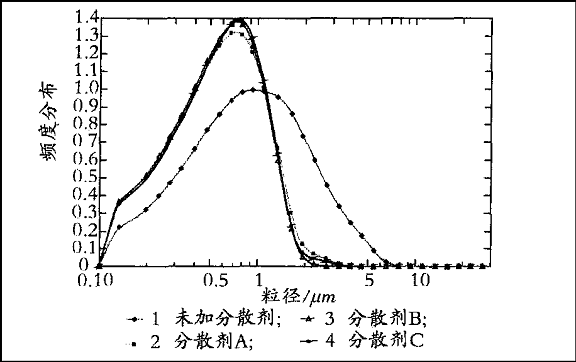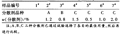分散劑是添加了固體粉料的涂料及相關產品(如著色涂料和顏料漿等)體系中不可缺少的添加劑之一。若分散劑選擇不當或用量不合適,會造成顏填料不能分散到需要的細度,分散體系不穩定,從而影響涂料的使用性能。如以二氧化鈦顏料漿中分散劑的選擇為例,借助激光粒度儀的測試結果確定分散劑的品種及用量。表1列出了試驗時選用的幾種分散劑及用量的配比。試驗時除了改變分散劑的品種及用量外,其余組分的品種和用量以及試驗條件完全相同。