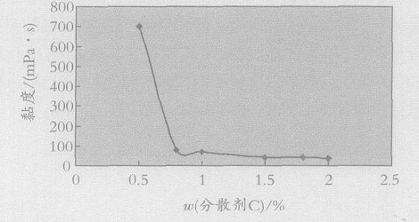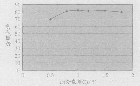 進一步對分散劑C的用量進行試驗,圖5為粒徑分布曲線;圖6為分散劑C用量與顏料漿黏度的關系圖;圖7為分散劑C用量與涂膜光澤的關系圖。從圖5可觀察到015%的用量,還不能使顆粒分散至需要的粒徑,且顏料漿的黏度偏大(見圖 6),涂膜的光澤偏低(見圖7)。1.0%及以上的用量可滿足實際應用的需要,已達到理想的分散效果。綜合考慮各種因素后確定分散劑C的用量為1.5%。