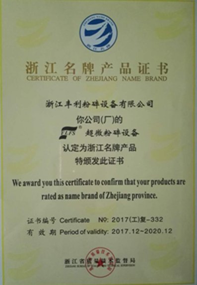 日前,國家高新技術浙江豐利粉碎設備有限公司FLFS牌“超微粉碎設備”,再次通過浙江省質量技術監督局的復評,認定為“浙江名牌產品”,有效期至2020年12月。連續六屆獲此殊榮,這在我國粉碎設備界僅此一家。