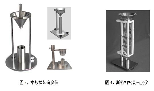 4、松裝密度:顆粒在規(guī)定的自然裝填條件下單位體積的質(zhì)量稱為松裝密度。自然填充狀態(tài)下的體積就是顆粒體積+顆粒上的開孔和閉孔體積+顆粒間空隙體積。松裝密度的別稱很多,有松堆密度、疏充填堆積密度、松密度、松散堆積密度、體積密度、毛體密度等。松裝密度的測(cè)量?jī)x器有常規(guī)松裝密度測(cè)試儀和斯特柯松裝密度測(cè)試儀兩種,常規(guī)松裝密度測(cè)試儀是粉體材料從漏斗中直接流到標(biāo)準(zhǔn)容器中;斯特柯松裝密度測(cè)試儀帶有阻尼板,粉體從漏斗中流出后,要經(jīng)過幾道阻尼板,以減少顆粒注入標(biāo)準(zhǔn)容器時(shí)的沖擊力,保證顆粒之間有自然的間隙。斯特柯松裝密度測(cè)試儀一般用于密度較大的金屬粉松裝密度的測(cè)定。
