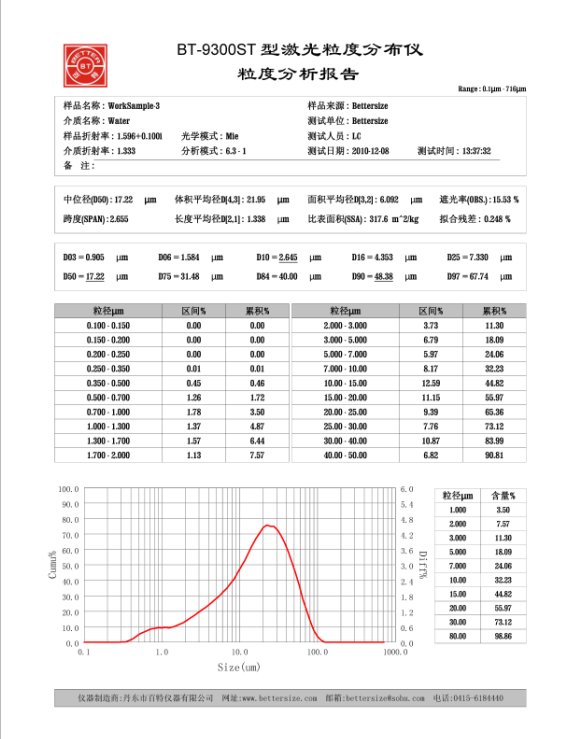 用特定方法測定的不同粒徑區間內的顆粒占總量的百分數稱為粒度分布。粒度分布有多種基準,如數量分布、長度分布、
