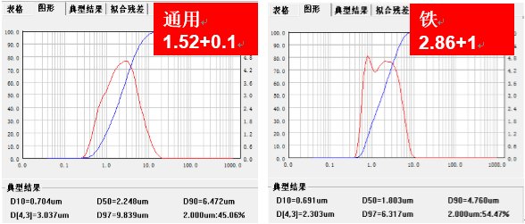 2、折射率發生改變:現代激光粒度儀一般采用Mie散射理論,選擇正確的折射率直接決定了測試結果的準確性,正確的折射率可以通過系統或測量來得到。下圖是同一樣品不同折射率時的測試結果差異。