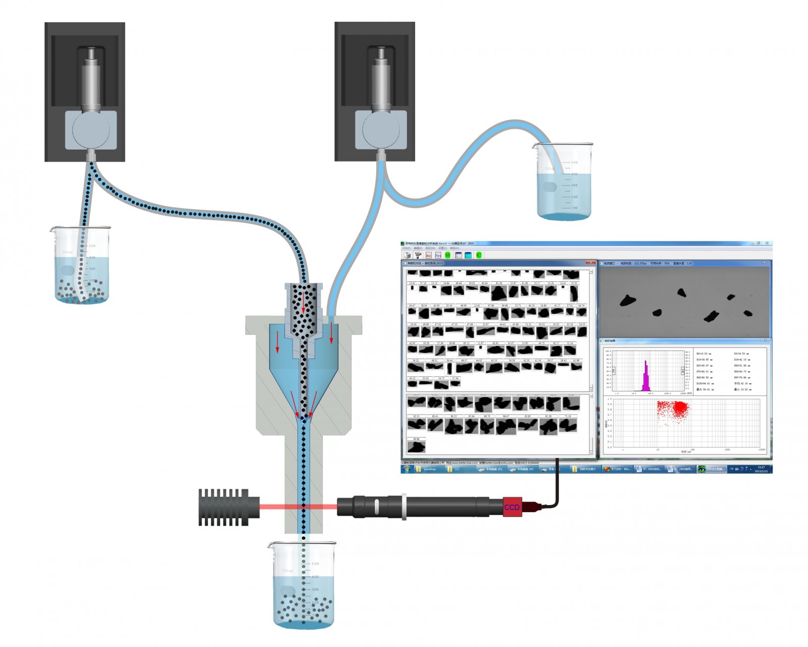 鞘流技術也叫液體聚焦技術,它是通過在樣品流的四周包圍一層流速更高的鞘液流,來約束樣品流中的顆粒不發散,使它們沿著近似直線的路徑流動,如果將這個近似直線的樣品流設置在鏡頭的焦平面上,則所有顆粒都將在焦平面上通過鏡頭,顆粒圖像將很清晰,保證了圖像粒度粒形分析的準確性。如果不采用這種技術,由于顆粒發散產生離焦,導致圖像模糊,給后續的圖像粒度粒形分析帶來誤差。所以,鞘流技術是提高動態圖像粒度粒形分析系統圖像清晰度,進而提高分析精度的有效手段。百特 BT-2800 動態圖像粒度粒形分析系統,就是采用這一先進技術的一種高性能動態粒度粒形分析系統。