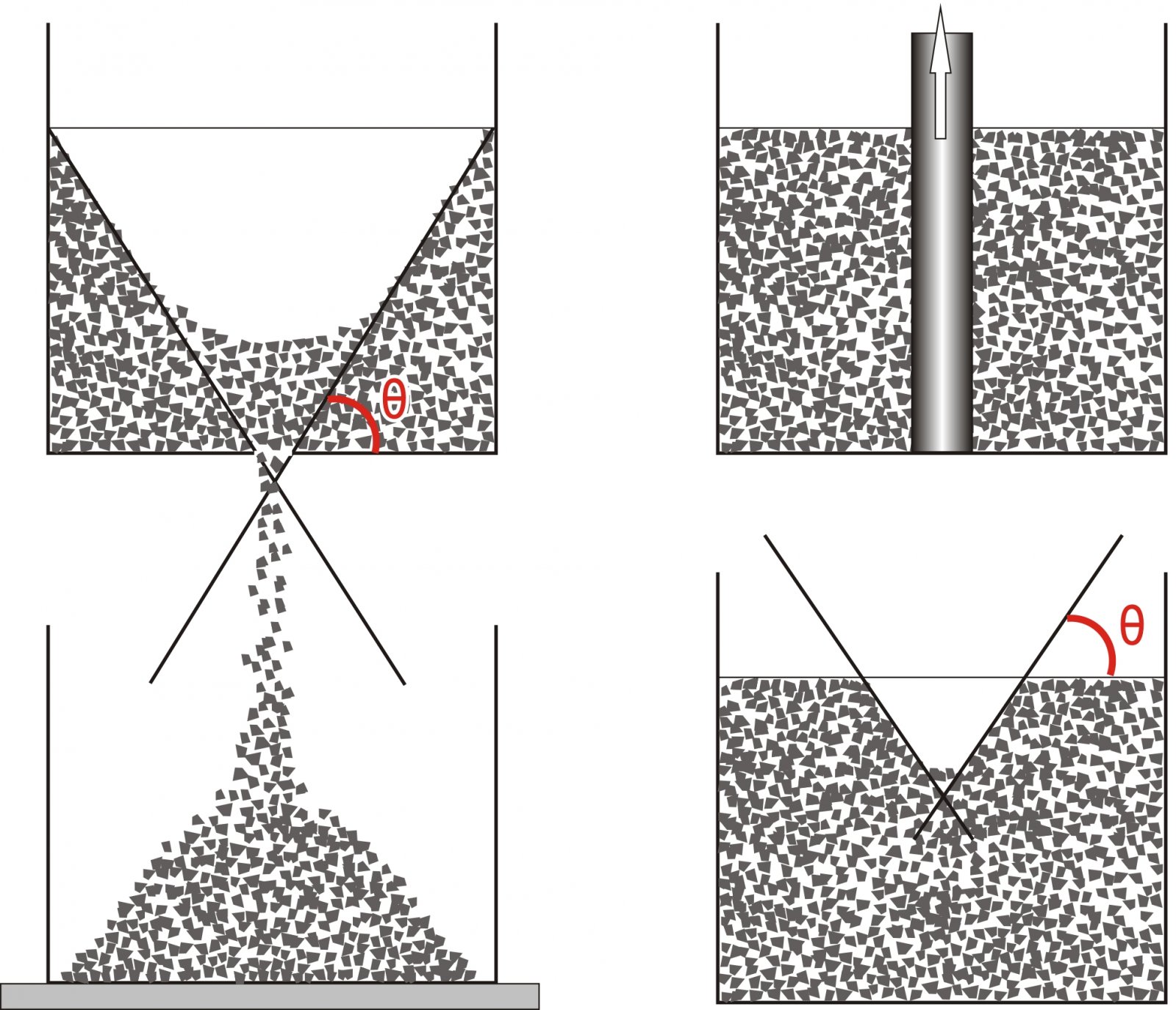 (2)圓棒張力實驗法(rod-tensiontest):一圓棒垂直地放置于容器中心,將粉體加入容器,使粉體表面水平,然后用力拉圓棒向上移動,移動面與水平面的夾角即是內摩擦角。
