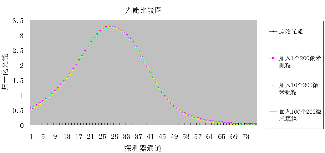 通過下圖我們還能看到,在原始光能分布中,分別加入1個、10個和100個200微米顆粒,然后比較光能分布圖,可以看出,在增加1個和10個顆粒,光能分布圖基本不變,增加100個顆粒光能分布圖才有微小變化,而且這些微小的光能變化可能比系統(tǒng)的噪聲還低,被系統(tǒng)的噪聲淹沒掉。