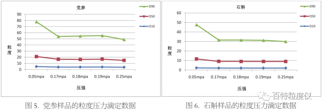 在干法測(cè)試中,我們采用的方式就是在不同的分散壓力下,考察壓力對(duì)粒度結(jié)果的影響。我們測(cè)試的壓力從 0.05Mpa 到 0.25Mpa 之間,其中橫坐標(biāo)是所加壓力,縱坐標(biāo)是顆粒粒徑大小,其中藍(lán)色、橙色以及灰色曲線分別代表D10、D50 和 D90 數(shù)據(jù)。較為理想的壓力滴定曲線,一般隨著壓力增大,顆粒粒徑逐漸變小,逐漸達(dá)到一個(gè)穩(wěn)定平穩(wěn)期,如果壓力進(jìn)一步增大,可能曲線會(huì)進(jìn)一步向下。這一般對(duì)應(yīng)著隨著壓力增大,大的團(tuán)聚體顆粒逐漸分散,達(dá)到單分散顆粒,如果壓力進(jìn)一步增大,可能會(huì)把藥物顆粒“打碎”。通過(guò)上述 6種中藥的壓力滴定,可以看出總體數(shù)據(jù)符合上述規(guī)律,都是隨著壓力先變小,然后逐漸達(dá)到一個(gè)穩(wěn)定的平臺(tái),最后可能發(fā)生“二次”下降。雖然有些藥物并沒(méi)有出現(xiàn)粒度二次下降,比如像石斛的壓力滴定數(shù)據(jù),但通過(guò)這些穩(wěn)定的平臺(tái),我們基本可以判定,在 0.18Mpa分散壓力下,數(shù)據(jù)風(fēng)險(xiǎn)比較低。