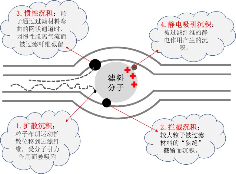首先,口罩是由多層濾料分子構(gòu)成,從圖中的口罩表面顯微成像可以看到,口罩結(jié)構(gòu)中有大量棒狀的纖維結(jié)構(gòu),這也就意味著氣溶膠顆粒在口罩里不是走直線的簡(jiǎn)單過程,而是在過濾層間擴(kuò)散、沉積、吸附的復(fù)雜過程。具體有如下幾種機(jī)制: