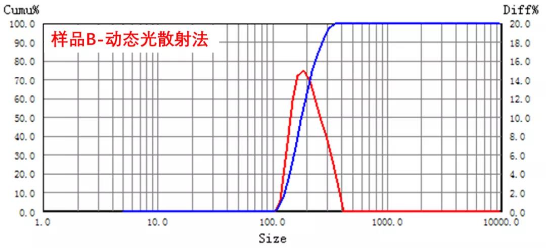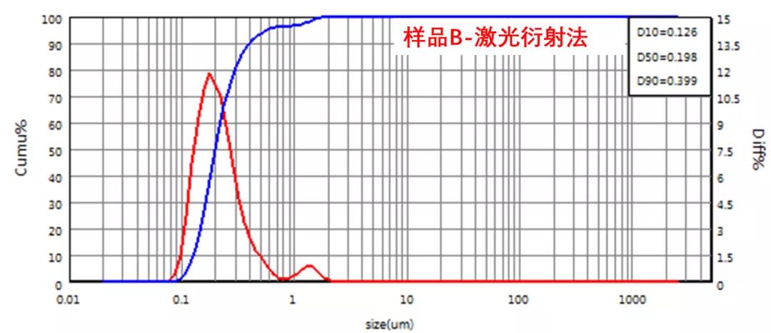 可以看到,A、B兩個樣品的粒度都是亞微米級的,中值粒徑在200納米左右,粒徑結果非常接近,并沒有展現出明顯差異。為了進一步考察,我們采用高性能激光粒度儀進行驗證,結果如下: