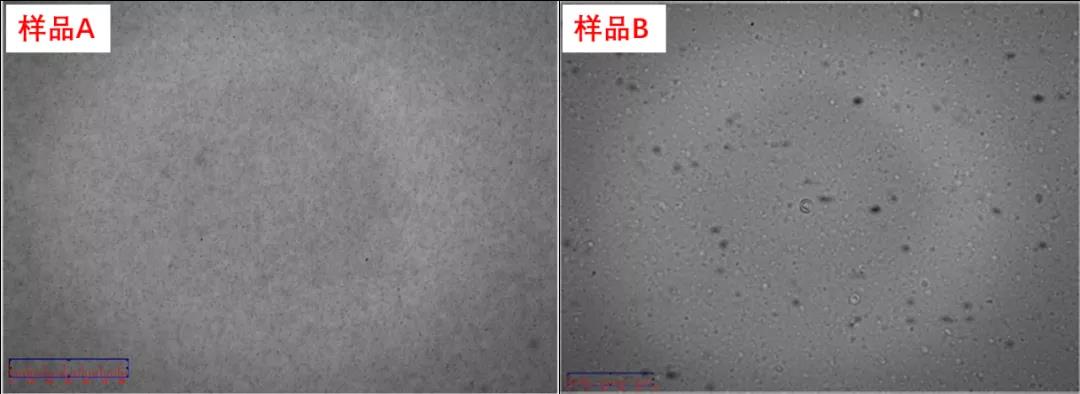 由于光學顯微鏡對于1微米以下的顆粒無法成像,所以在樣品A的光學顯微圖像中看不到顆粒,說明其中沒有粗顆粒。樣品B的顯微圖像中就能看到一些顆粒,說明樣品B確實有一定量的大顆粒,跟激光粒度儀的結果是一致的。