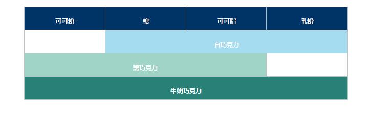 將可可漿與可可脂或其他成分按不同比例混合在一起,可以制成不同類型的巧克力,常見的有黑巧克力、白巧克力、牛奶巧克力等,表1展示了它們之間成分的差別。