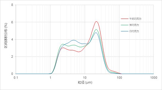 圖1:同一品牌的牛奶巧克力、黑巧克力和白巧克力的粒度分布