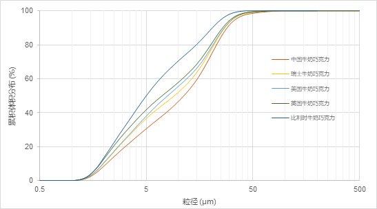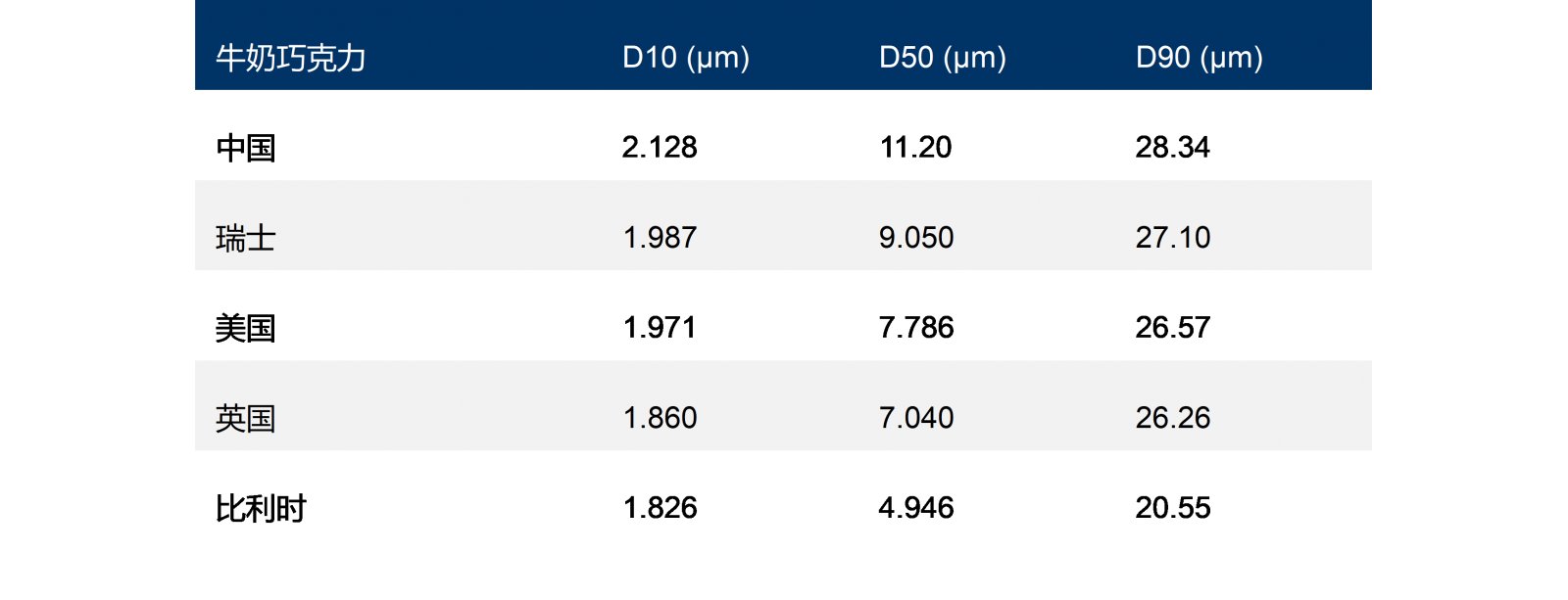 表2:不同國家的牛奶巧克力粒度分布的典型粒徑值