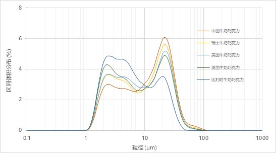 這些巧克力盡管種類不同,但都顯示了近似多峰的粒度分布曲線,這是因為巧克力含有多種成分,不同成分間的顆粒大小有差異,導致混合后的曲線分布較寬,近似多峰。