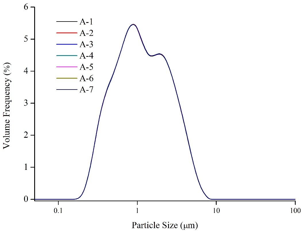 那么,用百特激光粒度儀測試鋰電池的正極材料的適用性怎樣呢?我們選擇了一種磷酸鐵鋰,連續(xù)測試7次,其中D10、D50和D90的重復(fù)性分別為0.13%, 0.07% 和 0.09%,這個精度遠遠低于激光粒度儀國際標(biāo)準(zhǔn)ISO13320的要求。因此采用Bettersize2600激光粒度儀檢測磷酸鐵鋰的粒度分布,其檢測結(jié)果可靠性較高。