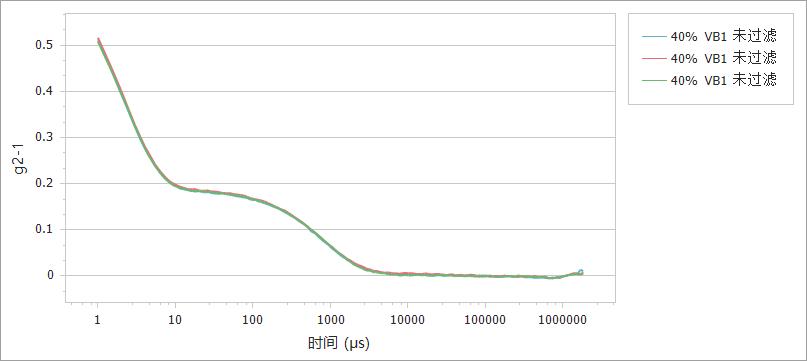 用純凈水作分散液配制40% w/w的維生素B1溶液,并把這種溶液分成兩份:一份是原液(未過濾)樣品,一份是用220 nm的PES水性濾膜過濾后的樣品。用百特最新研制成功的BeNano 90納米粒度儀分別對原液和過濾液進行粒度測試,重點查看平均粒徑和PD.I的差別。測試過程中把樣品放到樣品槽中恒溫120秒,當(dāng)溫度達到平衡時連續(xù)測試三次。