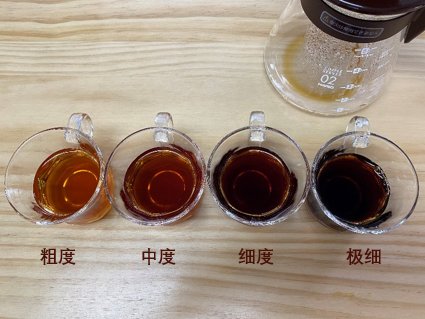 我們取相同質量的四種咖啡粉,用相同體積和溫度的水,在相同的時間里沖泡四杯咖啡。從圖3可以看出,粗度咖啡粉沖泡出來的咖啡顏色最淺,玻璃杯底清晰可見;極細的咖啡粉沖泡的咖啡顏色最深,幾乎看不到玻璃杯底;其它兩杯咖啡隨著粒度變小,顏色在變深。