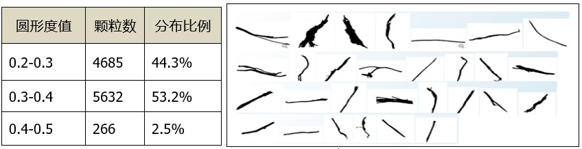 3號樣品的顆粒形狀多數(shù)近似于線條型,所有顆粒的圓形度都在0.5以下,圓形度在0.2~0.4的顆粒占97.5%。