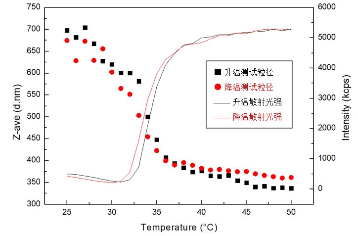 可以看到,在升溫過程中,溫度轉變點滯后于降溫過程中的溫度轉變點,這是由于在升溫過程中PNIPAm形成氫鍵,需要吸收能量,而降溫過程中氫鍵斷裂釋放能量造成的。