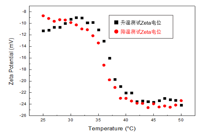 圖2中展示了PNIPAm水凝膠的Zeta電位隨溫度變化曲線。可以看到在檢測溫度范圍內PNIPAm水凝膠eta電位為負值,說明這個樣品攜帶負電,Zeta電位絕對值隨著溫度升高逐漸增大。在25℃時,PNIPAm的Zeta電位約為-10 mV,而當溫度上升到50℃時,其電位上升到約-24 mV。升溫過程和降溫過程,樣品的Zeta電位對于溫度的依賴性基本一致。