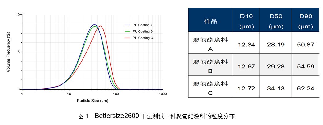 粒度分布的測試方法有很多,激光衍射法測量速度快、動態(tài)范圍寬、代表性好,是粉末涂料行業(yè)中的主流測試方法。根據(jù)進樣方式的不同,激光衍射法還分為干法和濕法兩種。干法以空氣為分散介質(zhì)直接測量干粉的一種方法,其優(yōu)點是操作快速、簡單且干擾因素較少。為避免液體介質(zhì)的影響帶來的不確定性,粉末涂料粒度測試中常常選用干法。圖1是Bettersize2600激光粒度分析儀干法測試三種聚氨酯粉末涂料的粒度分布結(jié)果。