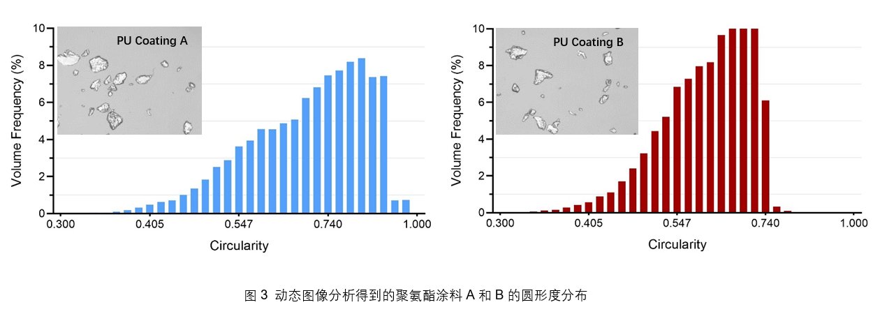 丹東百特儀器有限公司的BT-2900動態(tài)圖像法粒度粒形分析系統(tǒng),由高速攝像機和精密顯微鏡為核心組成,能夠全面呈現(xiàn)粉末涂料顆粒的形狀。圖5是用BT-2900測試兩種聚氨酯粉末涂料的圓形度,A的平均圓形度為0.717,跨度為0.486;而涂料B的平均圓形度為0.654,跨度為0.386。據(jù)此得出涂料A比B的平均圓形度更高,有更好的流化性能。除分析粒形外,BT-2900對粗端顆粒具有更高的分辨力和靈敏度,能準確捕獲到大顆粒,從而有利于粉末涂料產(chǎn)品的質(zhì)量控制。