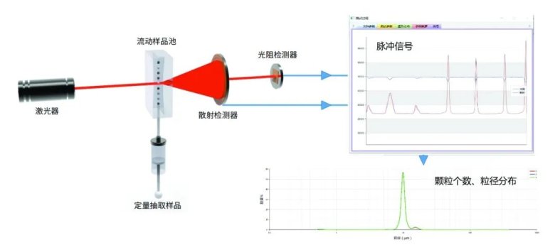光阻法顆粒計數器的原理是一束片狀激光始終照射玻璃毛細管測量區,用柱塞泵使水樣流過毛細管測量區,當水樣中有顆粒通過測量區時,因為顆粒的遮擋和散射將使透過測量區的光產生與顆粒大小成正比的衰減信號和散射信號,通過傳感器接收這些信號,再用專門的分析軟件對這些信號進行處理,從而得到顆粒大小、個數和粒度分布信息。