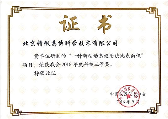 科學(xué)技術(shù)獎(jiǎng)有嚴(yán)格的評(píng)審標(biāo)準(zhǔn),中國(guó)儀器儀表學(xué)會(huì)科學(xué)技術(shù)獎(jiǎng)評(píng)審委員會(huì)按照《中國(guó)儀器儀表學(xué)會(huì)科技獎(jiǎng)獎(jiǎng)勵(lì)條例》的規(guī)定對(duì)申報(bào)項(xiàng)目進(jìn)行了嚴(yán)格認(rèn)真的初審、會(huì)評(píng)。北京精微高博科學(xué)技術(shù)有限公司“一種新型動(dòng)態(tài)吸附法比表面儀”項(xiàng)目在技術(shù)研發(fā)團(tuán)隊(duì)的積極努力下,不斷進(jìn)取,堅(jiān)持自主創(chuàng)新,獲得國(guó)家發(fā)明專利二項(xiàng),比表面及孔徑分析技術(shù)在國(guó)內(nèi)遙遙領(lǐng)先,不愧為“中國(guó)氣體吸附分析儀的開(kāi)拓者和領(lǐng)航者”的稱號(hào),在眾多申報(bào)項(xiàng)目中脫穎而出,榮獲“科學(xué)技術(shù)三等獎(jiǎng)”。