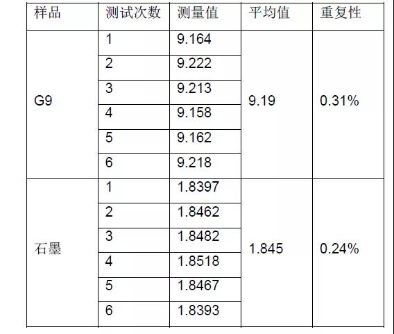 如表1選取炭黑G9標(biāo)樣,以標(biāo)準(zhǔn)偏差計(jì)算重復(fù)性為0.31%,同樣石墨樣品重復(fù)性0.24%,遠(yuǎn)小于標(biāo)稱指標(biāo)1%,說(shuō)明儀器對(duì)同一樣品反復(fù)測(cè)試的結(jié)果是非常穩(wěn)定的,在質(zhì)量控制中,出現(xiàn)需要復(fù)檢的樣品的時(shí),完全有信心排除儀器本身的誤差,不會(huì)造成誤判。