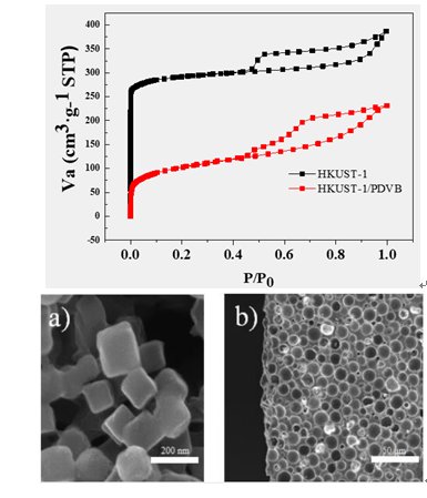 (1)純MOF與多級(jí)孔修飾MOF結(jié)構(gòu)的氮?dú)馕摳角€變化,對(duì)應(yīng)的SEM變化,其中紅線代表的多級(jí)孔修飾MOF結(jié)構(gòu)。