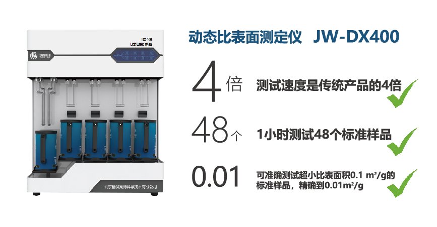 動態吸附法比表面測定儀JW-DX400適用于企業的質量控制部門的來料檢測,準確度與高效率兼具。JW-DX系列采用專利號為20140320453.2的吸附法專利測試,完全避免了常溫下樣品脫附不完全帶來的測試誤差,非常適合粉體、顆粒材料的在線快速測定。