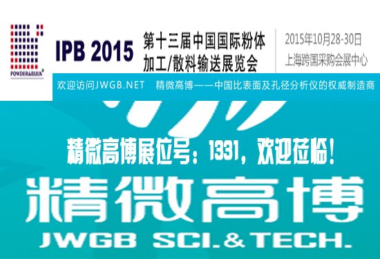 北京精微高博科學技術有限公司作為中國比表面及孔徑分析儀的開拓者和領航者應邀參加將于2015年10月28-30日在上海跨國采購會展中心舉行的IPB 2015第十三屆中國國際粉體加工/散料輸送展覽會。屆時,精微高博在1331展臺展示自主研發的表面物性分析儀器設備JW-BK132F全自動比表面及孔徑分析儀,該儀器被用戶評為“國產好儀器”,成為中國首臺也是唯一一臺獲得“國產好儀器”稱號的比表面及孔徑分析儀。