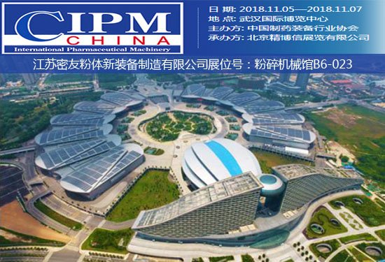 2018年第56屆全國制藥機械博覽會將于11月5日--7日在湖北武漢國際博覽中心召開,將吸引來自歐美日韓等21個國家和地區(qū)的1100余家展商參展,展覽面積達(dá)13萬平米。江蘇密友粉體新裝備制造有限公司將在粉碎機械館 B6-023展位亮展,期待您的蒞臨。