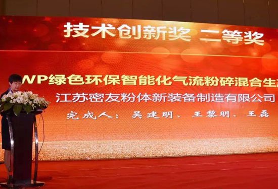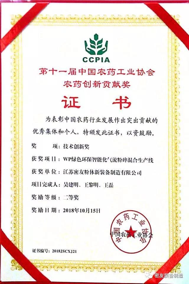 江蘇密友粉體新裝備制造有限公司的“WP綠色環保智能化氣流粉碎混合生產線”喜獲“第十一屆農藥創新貢獻獎之技術創新獎二等獎”。