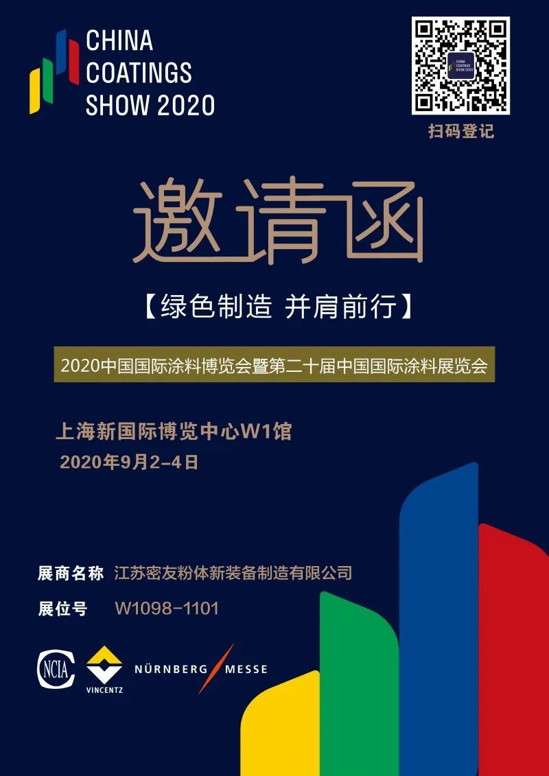 “綠色制造,并肩前行”為主題2020中國國際涂料博覽會暨第二十屆中國國際涂料展覽會,將于9月2日-4日在上海新國際博覽中心舉行。江蘇密友粉體新裝備制造有限公司將盛裝亮相2020涂博會。
