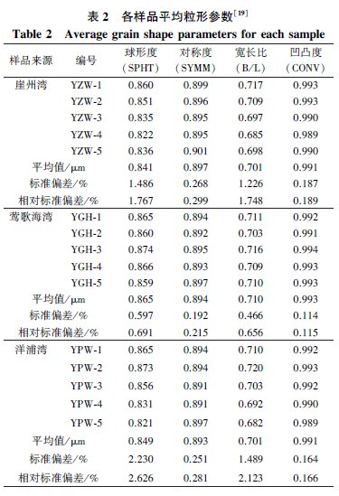 表2 測量結(jié)果顯示,崖州灣岸灘斷面五個部位的球形度和寬長比的相對標準偏差都在1.75%左右;對稱度和凹凸度的相對標準偏差都在0.2%附近,這相對于球形度和寬長比穩(wěn)定了很多;說明了在同一岸灘斷面不同部位,球形度和寬長比變化非常大,而對稱度和凹凸度的變化相對較小,這個結(jié)論和顆粒形狀參數(shù)累計曲線得到的結(jié)果一致。然后分析鶯歌海灣和洋浦灣的數(shù)據(jù)結(jié)果也得到了類似于崖州灣的結(jié)論。