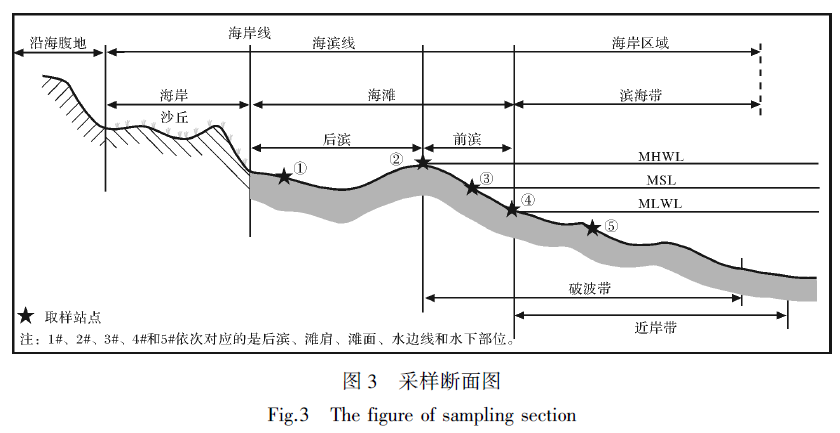 實驗選取采自2013 年12 月海南島崖州灣、鶯歌海灣和洋浦灣5 個代表性海灘斷面的20 組沉積物樣品(圖2),其中五個樣品來自崖州灣的一個斷面,從后濱到水下部位(海灘斷面采樣圖見圖3)依次編號為YZW?1~YZW?5,以此類推來自鶯歌海灣和洋浦灣的樣品分別編號為YGH?1~ YGH?5、YPW?1~ YPW?5和YPW?6~YPW?10;重復性實驗的樣品來自崖州灣的YZW?1。測試前,先對樣品進行預處理[16] :用純水浸泡清洗,洗去樣品中的鹽份,然后在烘箱中干燥8~12 h,置于干燥器中冷卻至室溫。將同一組樣品混勻后用二分器一分為二,分別用于多功能粒徑粒形分析儀和篩析法測量。