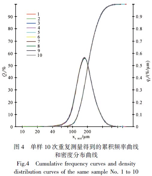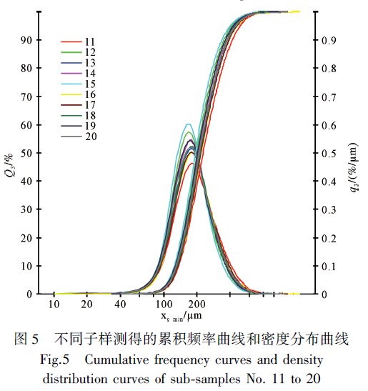 圖4 中10 種不同顏色的曲線分別表示同一樣品重復測量10 次的結(jié)果,可以看出10 條曲線幾乎完全重合;各密度曲線之間的縱向和橫向差值都十分微小,基本可以忽略不計;從直方圖可以看出單樣每次測量在不同的粒徑區(qū)間有微小的差別。圖5 是分別選取10 組子樣進行測量得到的曲線,各曲線的重合度較1#~10#的曲線圖差,各曲線稍微要分散一些;從密度分布曲線來看最大峰值和最小峰值相差10%~15%,累積頻率曲線圖的最大差值在0.1%~0.2%之間。