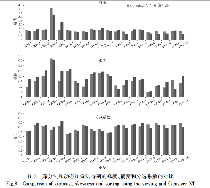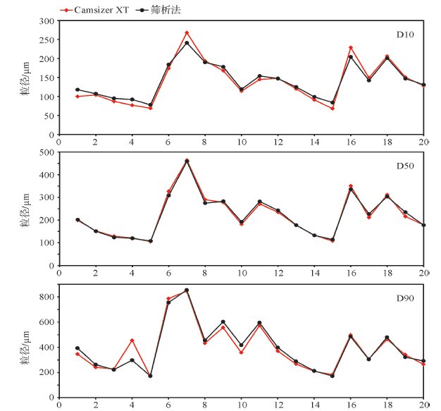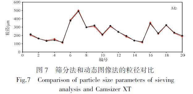 從方法本身來講,篩析法是用標準篩通過振動分級來得到沉積物的粒度值,測量前的準備和測量過程中隨機因素非常多,這些都有可能帶來粒徑的測量誤差;Camsizer XT 動態(tài)圖像法利用雙CDD 雙攝像頭拍攝,用光學手段直接測量顆粒的粒徑,準確度高于利用間接法獲取顆粒粒徑的篩析法。