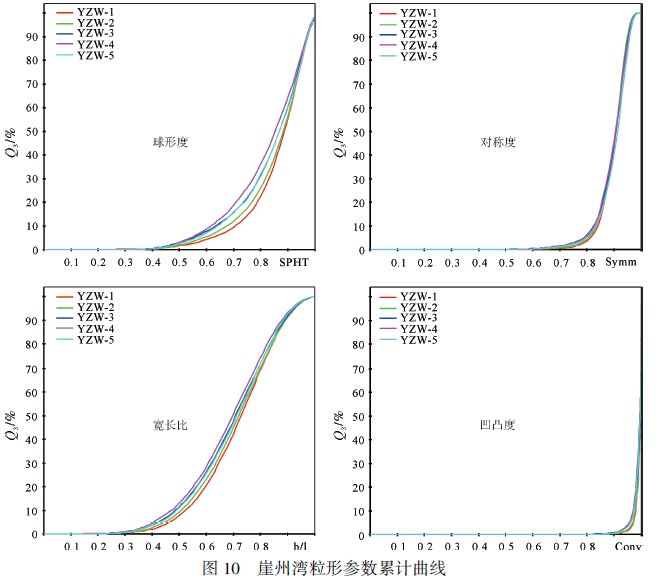 圖10、11、12 分別示意了崖州灣、鶯歌海灣和洋浦灣的粒形參數(shù)累計曲線。對比三個海灣斷面的球形度、對稱度、寬長比和凹凸度可以得出不同的海灣粒形參數(shù)有很大差別,間接地說明了各海灣的顆粒所受的水動力條件和岸上風化侵蝕有很大區(qū)別。對比同一斷面不同岸灘部位的同一個粒形參數(shù)可以得出:后濱、灘肩、灘面、低潮線和水下部位的球形度相差最大,在同一Q3值下最大差值接近0.2,其次是寬長比,對稱度和凹凸度變化范圍最小。