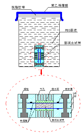 本次試驗(yàn)所用的低吸力段的吸力控制點(diǎn)見表3。首先根據(jù)吸力算得Brix指數(shù)調(diào)配吸力為1MPa的PEG溶液,將裝好半透膜的試樣放入裝PEG溶液的燒杯中,燒杯表面用聚乙烯薄膜蓋住,周圍用脫脂帶密封,如圖6所示。半透膜的安裝方法為:事先將半透膜放入水中浸泡半小時(shí)左右,消除半透膜保護(hù)層對(duì)試驗(yàn)的影響,在試樣環(huán)蓋擰上螺絲之前在試樣兩側(cè)放上半透膜,使試樣通過試樣環(huán)蓋中的小孔和半透膜與外界的PEG溶液進(jìn)行吸力平衡。在滲透吸力的作用下,膨潤土與溶液將發(fā)生水的交換。如果土中吸力大于溶液所加吸力,水從溶液向土中滲入;相反如果土中吸力低于所加吸力,水從土中向溶液外滲。為了使交換水份不影響溶液的濃度,須保證溶液濃度維持不變。待十天左右試樣吸力平衡后,將試樣取出,稱重,記錄,并用折射計(jì)測(cè)出土樣平衡后的PEG溶液濃度,從而可以得出試樣的最終吸力值。然后,拆解試樣環(huán),重新在試土樣兩側(cè)裝入新半透膜,安裝好后再放入吸力為0.1MPa的PEG溶液中平衡,重復(fù)前述操作。最后,再在吸力為0.01MPa的PEG溶液中重復(fù)試驗(yàn)。
