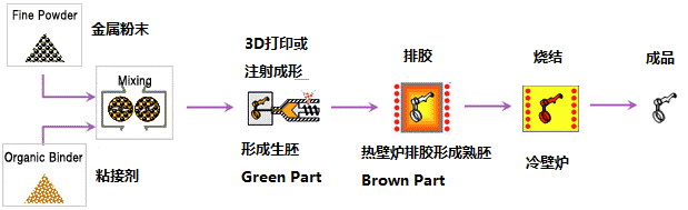 金屬增材制造(AM)可分為直接成型和間接成型兩種。間接增材制造工藝和粉末注塑成型工藝中(陶瓷注塑成型簡稱CIM,金屬注塑成型簡稱MIM),初始粉末需要和粘接劑充分混合,生坯成型后,粘合劑則需要通過加熱、催化或溶解等方法去除(會導致部件收縮),得到棕坯(brown Parts)后再燒結,使零件具有最終的形狀和性能。