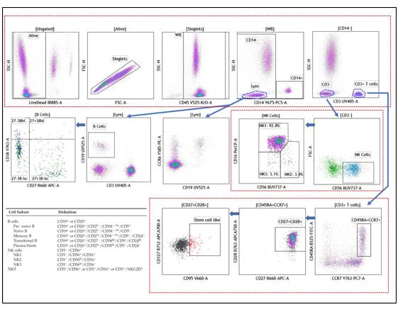 Dr. Ravi Mylvaganam采用20個(gè)熒光抗體以及一個(gè)細(xì)胞死活染料組成21色的panel,可同時(shí)檢測(cè)多群記憶、效應(yīng)T細(xì)胞,調(diào)節(jié)性T細(xì)胞,NK細(xì)胞甚至是干細(xì)胞樣T細(xì)胞等細(xì)胞亞群,詳細(xì)的抗體和染料標(biāo)記如下所示: