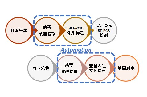 小貝為你提供從自動化的樣本核酸提取,到實時熒光RT-PCR體系構建,以及宏基因組文庫構建的高通量、高效率自動化核酸檢測方案。加速實驗進程、保證人員安全、避免人為錯誤,為病毒核酸的準確檢測保駕護航。