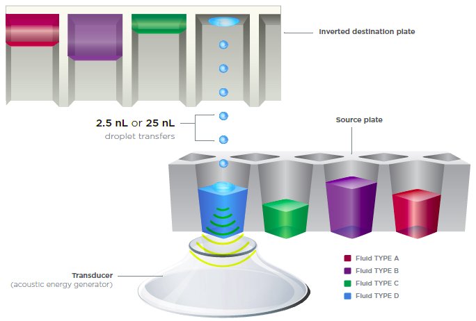 Echo采用聲波能量精準地轉移液體(Acoustic Droplet Ejection,ADE),無需接觸和使用吸頭、噴嘴或導管等工具,并保證每一個液滴都只有2.5nL或25nL,同時可實現動態液體分析(Dynamic Fluid Analysis?,DFA),通過聲能判斷液體組成成分、液體高度,進而計算向目標板中轉移準確體積所需的能量,實現準確移液。Echo創新的聲波移液技術,正在改變生命科學液體處理的格局,其無與倫比的速度、精度、準確性和成本效益正在幫助世界各地的科學家實現更好的科學數據和結果。革命性的聲學移液技術正在改變實驗室的研究方式,從學術界到制藥界,從基礎生命科學到轉化醫學。
