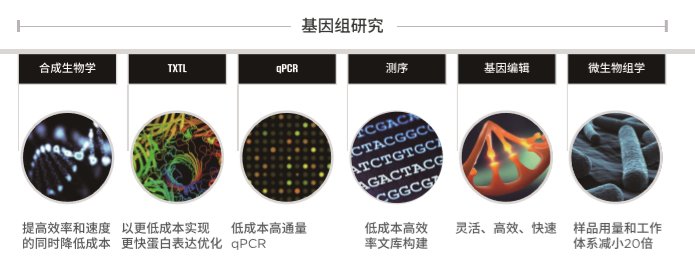 Echo的另一大應用是基因組研究,目前Echo已經應用在基因表達、基因分型、微生物組、qPCR、測序、單細胞基因組和合成生物學等。Echo的納升移液功能可以降低反應體系幾十倍甚至上百倍,使其微量化,同時Echo的非接觸式傳輸也消除了基因組研究中容易導致的交叉污染,以確保可靠和可重復的數據。Echo移液系統和貝克曼庫爾特Biomek移液工作站、Genomics試劑一起,可以給用戶提供從樣本制備、反應體系微量化、產物純化、試劑耗材等一站式服務。