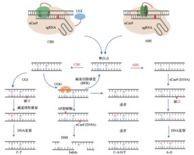 將失去催化活性的Cas蛋白(dCas)或只有切割一條鏈活性的Cas蛋白(nCas)和可作用于單鏈DNA的脫氨酶進行融合,實現(xiàn)對靶點堿基替換的胞嘧啶堿基編輯器(CBE)和腺嘌呤堿基編輯器(ABE)[2];