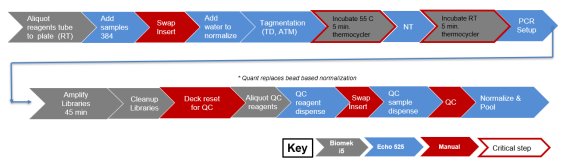 圖2. 微量化Illumina Nextera XT文庫制備的自動化流程。灰色代表Biomek i5完成步驟,藍色代表Echo 525完成步驟,紅色代表手工干預步驟。Echo用于反應體系構建及Normalization/pooling;Biomek配置384通道加樣器,并具有選擇性吸頭移液功能,用于分裝Echo所需試劑并進行產(chǎn)物純化;可選配臺面整合的PCR儀,用于PCR擴增和孵育,減少人為干預。