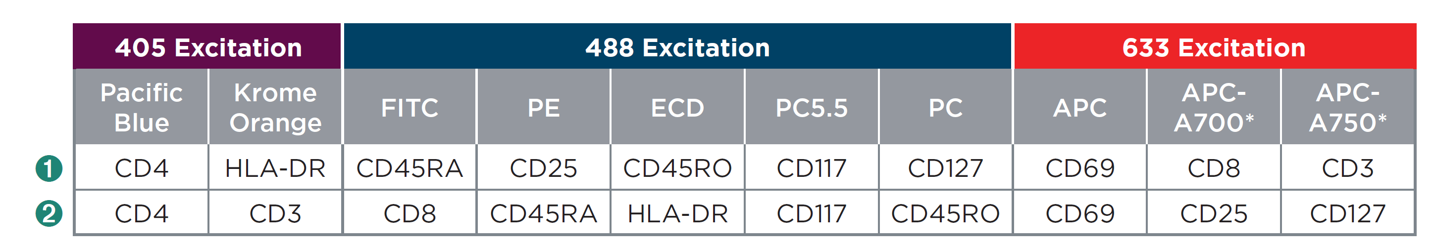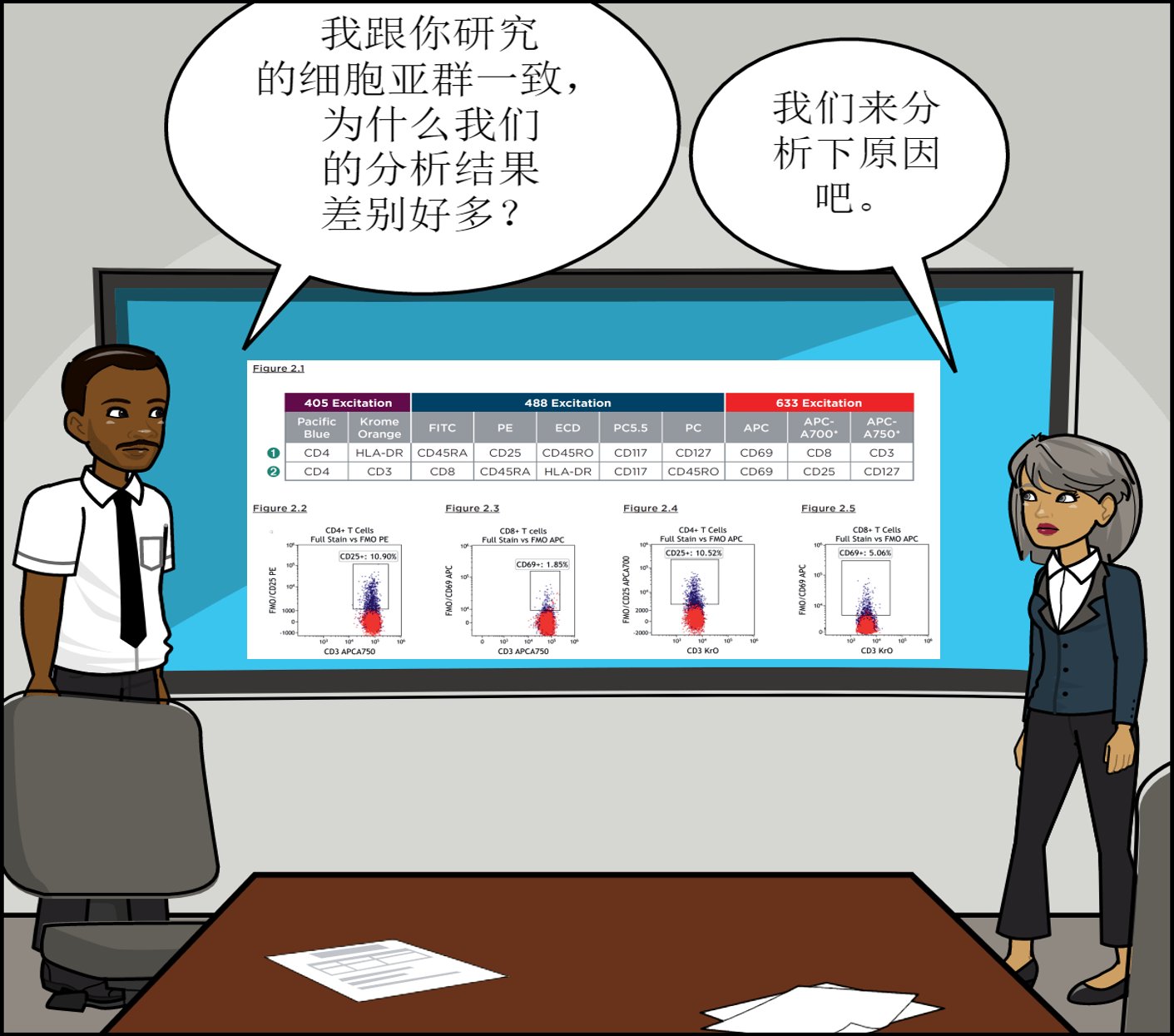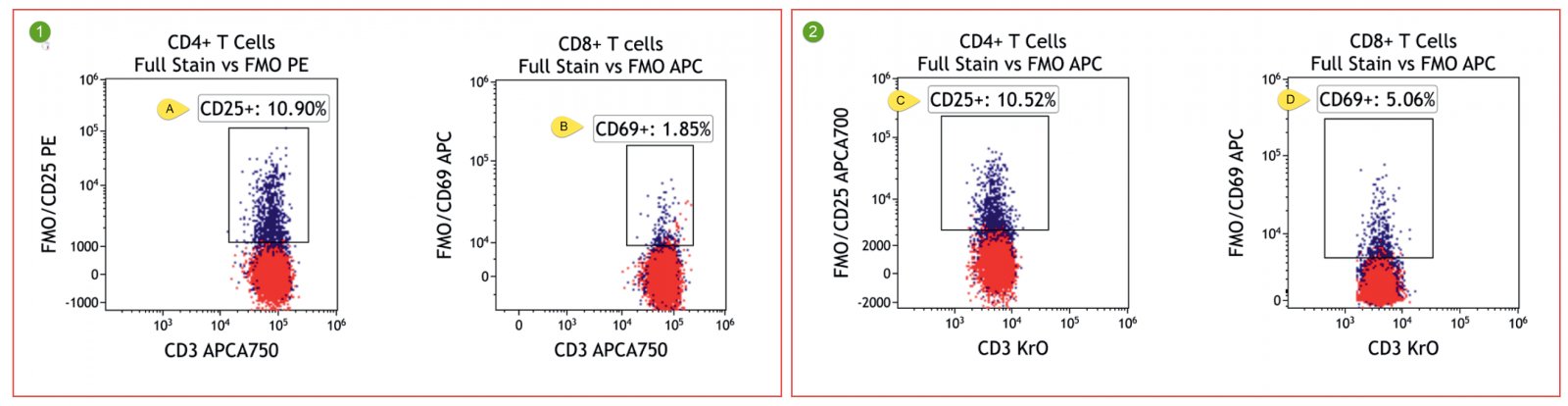 方案1與方案2,所選擇的marker都完全一致,所選用的熒光素種類一樣,但是搭配不一樣。那么我們看看同一個樣本,最后各個細胞亞群的結果一樣嗎?