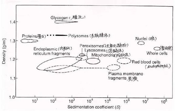 由于大部分的生物大分子的沉降系數都在10-11-10-13s(秒)范圍內,故定義了沉降系數的單位S,1 S = 1 x 10-13s(秒)。s 值經常被用來描述生物大分子(如核酸、蛋白)和一些大分子復合物(如核糖體、核糖體亞基),參見圖3。蛋白的沉降系數在1-20S之間,核酸的沉降系數在5-100S 之間,亞細胞器的沉降系數則更大,基本在幾百S 到幾千S之間。