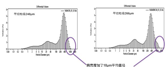 圖4:咖啡樣品,分布較寬,納米到1000+微米,2個批次僅在1000+微米處有一點變化導致平均粒徑變化18微米,高分辨技術仍然可以精準地捕捉到,幫助QC很好實現質控。